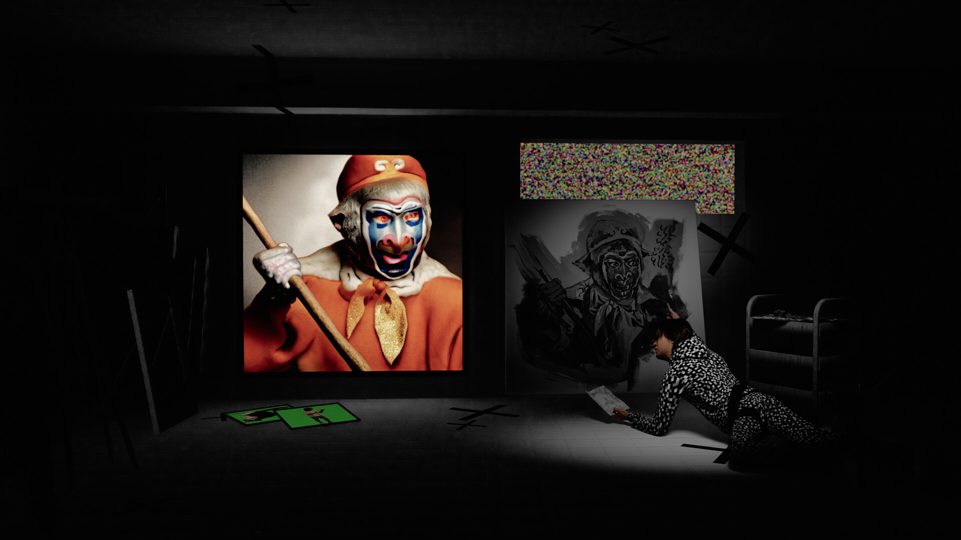 In this future, the protagonist wears a RV (Real Virtuality) headset that claim to show "reality" within the "virtual." The seemingly real traces revealed by the RV glasses (such as unfinished noise and uncolored white objects) trigger his mental breakdown and fear of reality.
